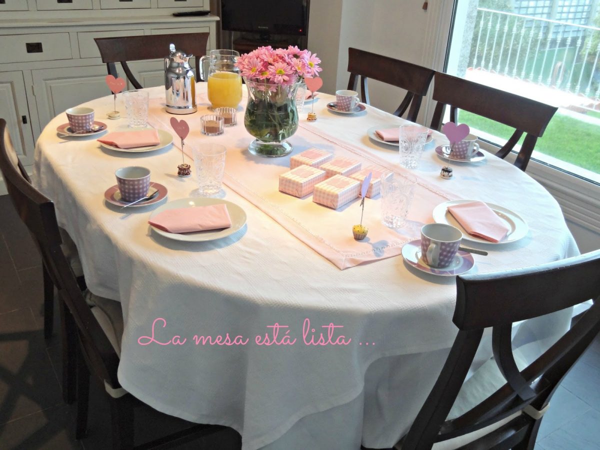 Decoramos la mesa la con mantel blanco y con un camino de mesa rosa palo, para romper un poco con el lila de la vajilla… en el centro del camino de mesa unas margaritas rosas para dar aún más ambiente romántico al desayuno…