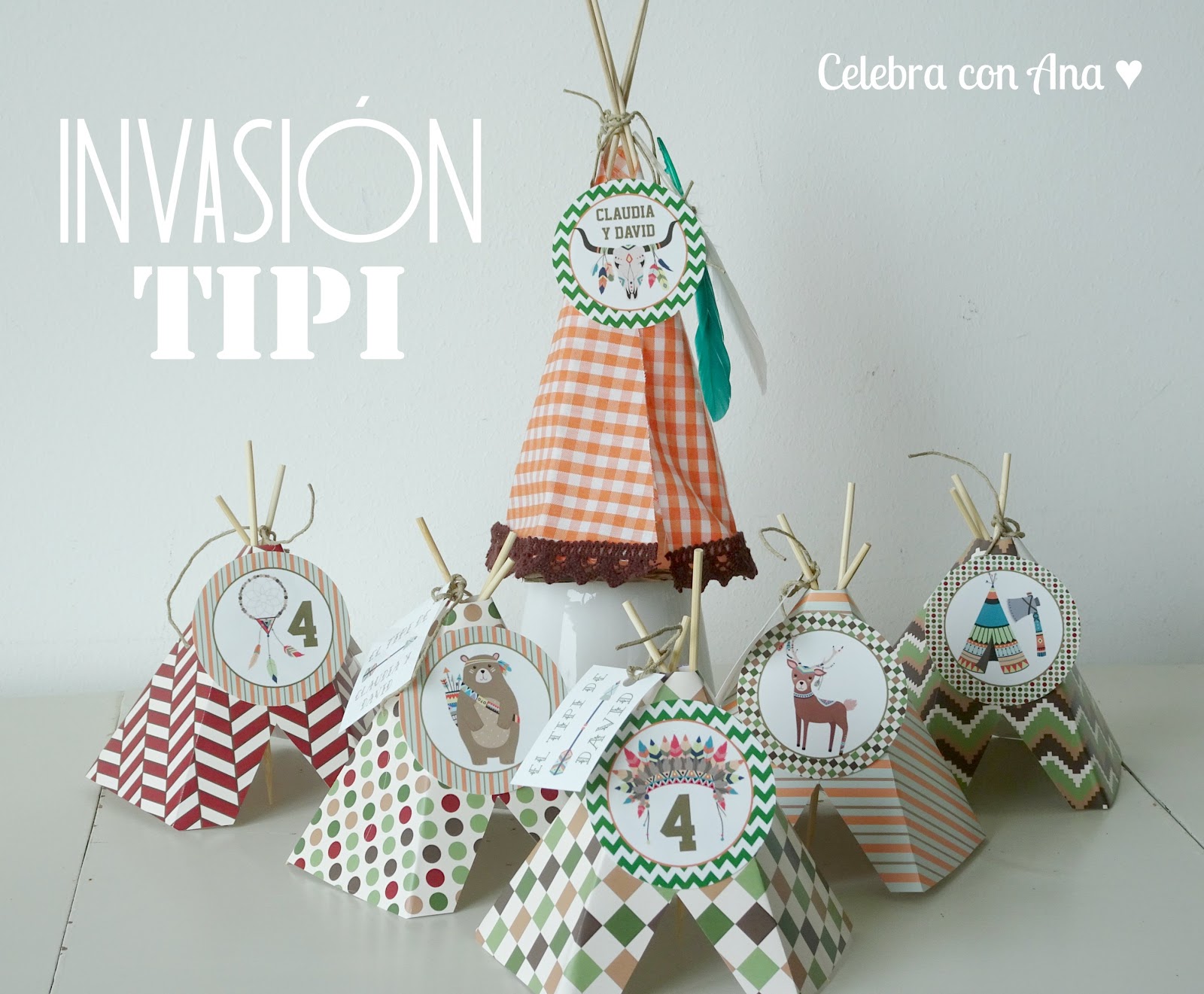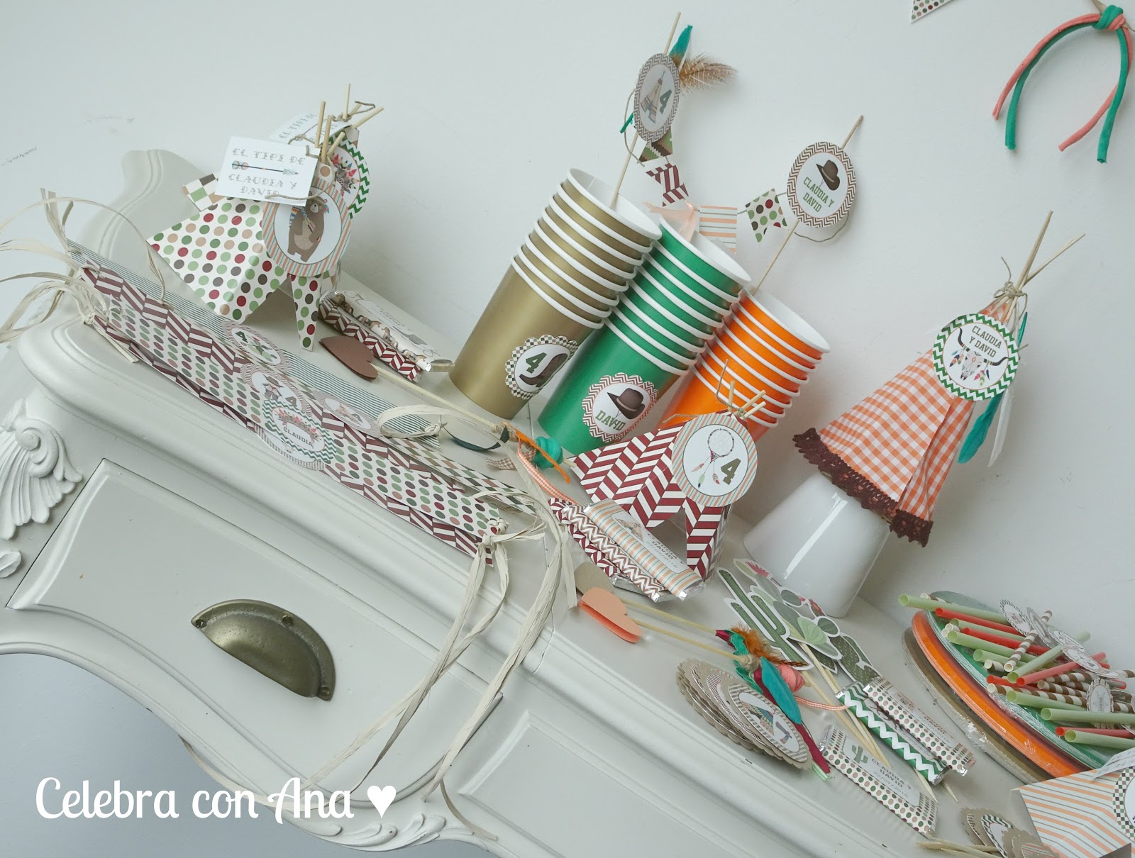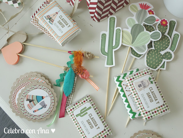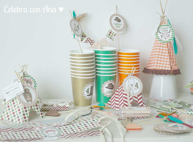 En este Kit de fiesta maravilloso había de todo un poco: la invitación que le preparé en formato digital para enviar por whatsapp a los amigos, platos y vasos, pajitas, guirnalda, bolsitas para regalos, chapas para los amigos de la clase, etiquetas de diferentes tamaños, chocolatinas decoradas, topper para la tarta de cumpleaños, toppers de cactus para pinchar en la comida, servilleteros para tacos de servilletas, flechas de adorno, y muchos tipis indios, decorado todo ello con mis maravillosas ilustraciones de indios y vaqueros 🙂