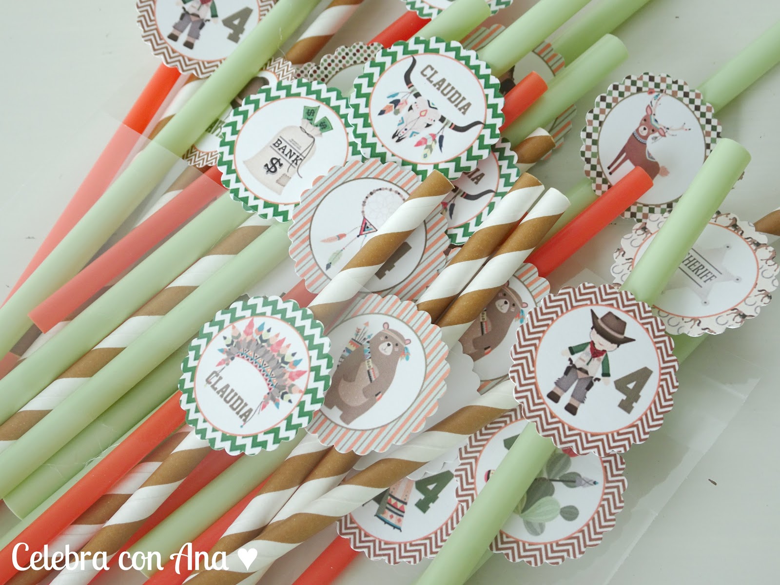 O las pajitas en los tonos de la fiesta, decoradas con sus etiquetas…. un detalle que hará aún más especial la mesa del cumple cuando la coloquemos.