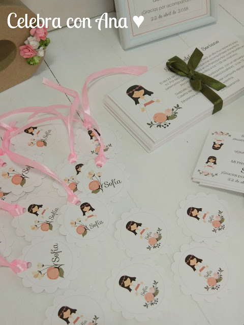 Preparamos las invitaciones, los puntos de libro, toppers para bolsitas de celofán en los que Pilar iba a meter ella misma los detalles para los invitados que había comprado para la comunión.