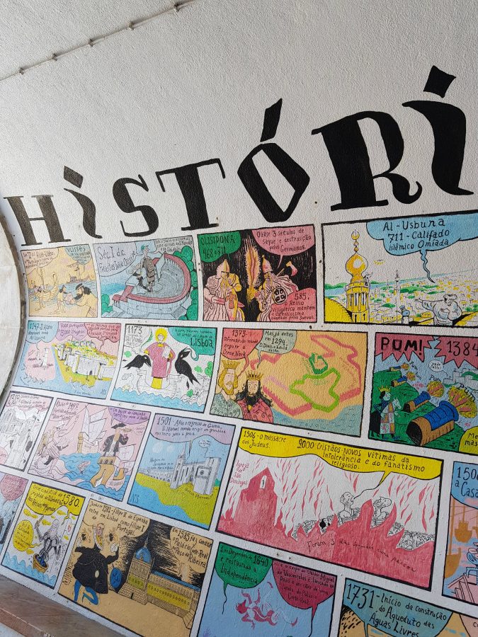 Bajo el Mirador Portas do Sol, una curiosidad: bajando unas escaleritas podréis ver un curioso túnel que han decorado con cómics que representan la hitoria de la ciudad: vale la pena bajar las escaleras y verlo antes de poner rumbo al siguiente destino…