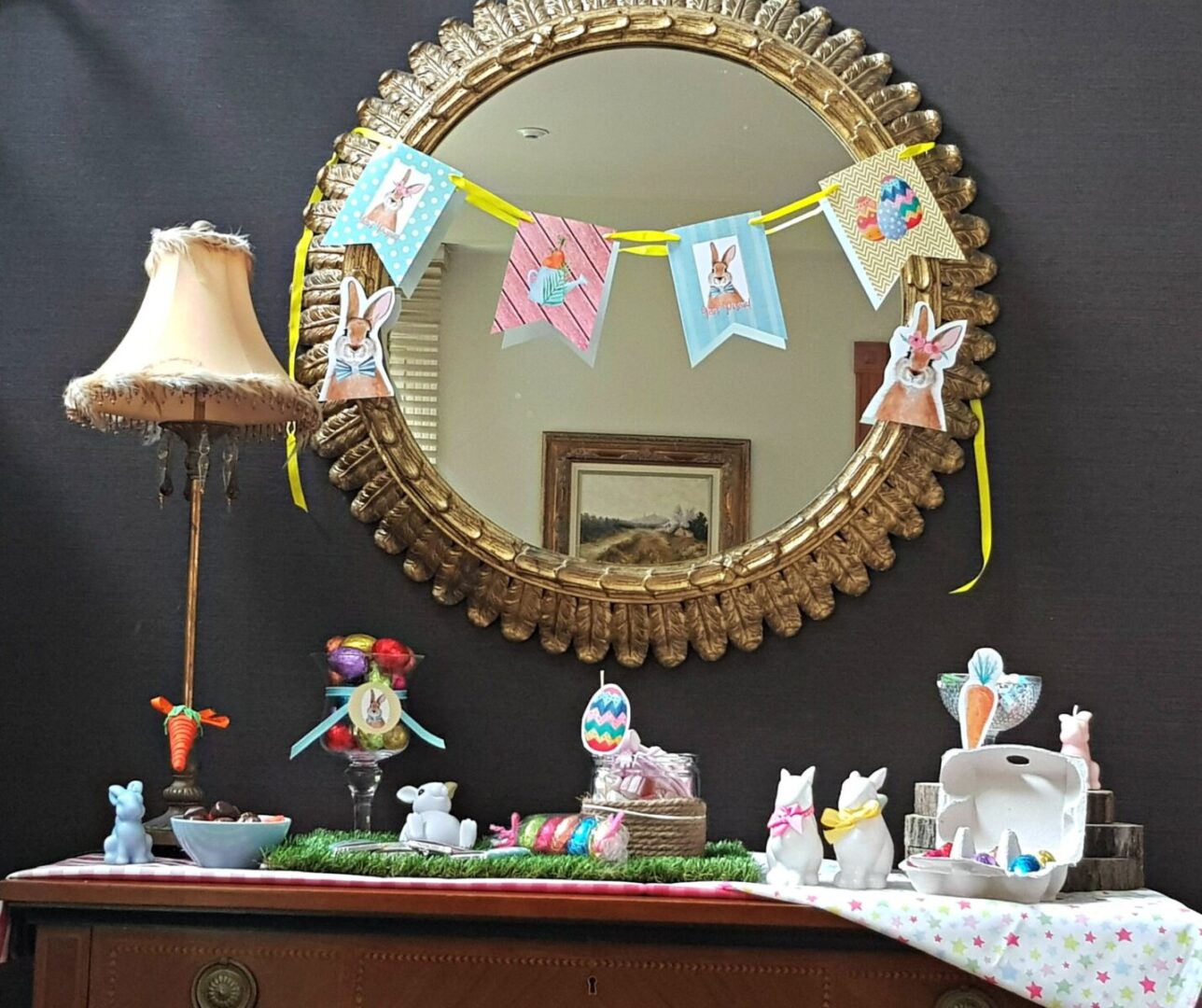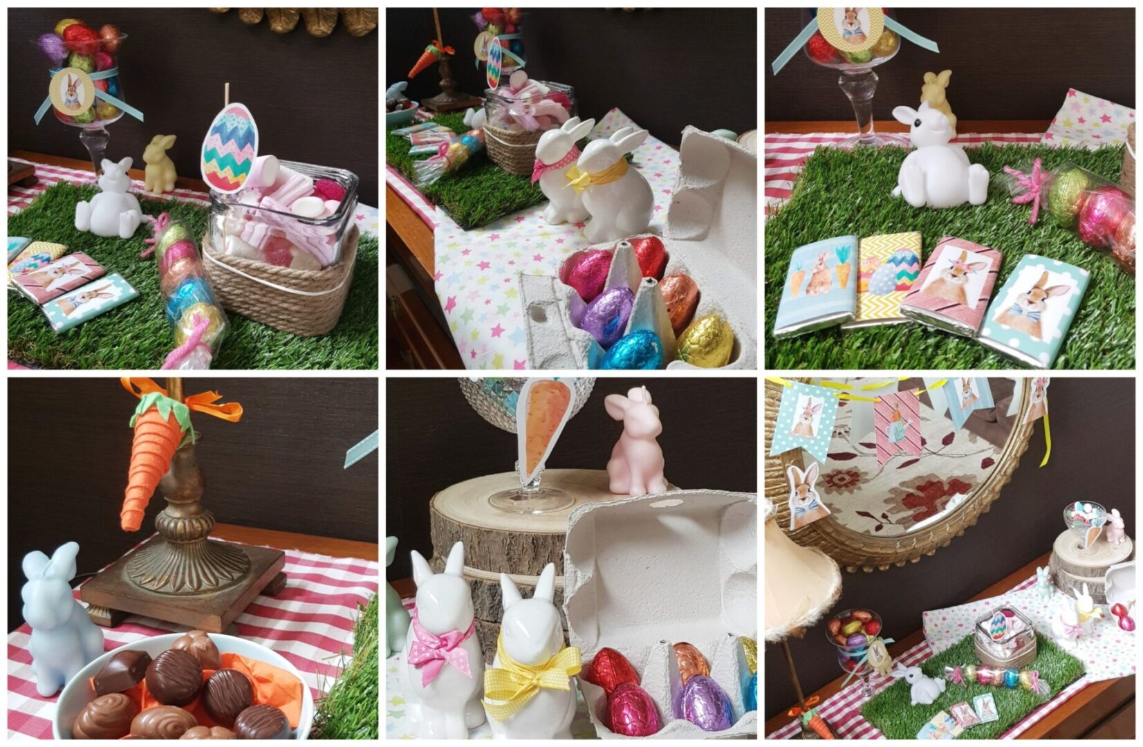 En mi caso, he tematizado un mueble que tengo a la entrada de casa…. para ello he aprovechado chuches y chocolates que tenía en casa y he decorado todo con mi Kit de Pascua imprimible que es…. para morirse de mono!!! El año pasado preparamos con él una merendola de Pascua en el jardín, con Egg Hunting incluido.