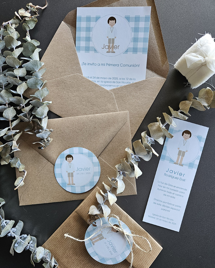 Los cuadros Vichy en tamaño XL están de moda, por eso no podían dejar de formar parte de nuestros Kits de Comunión. Te presentamos la opción en Azul Bebé.